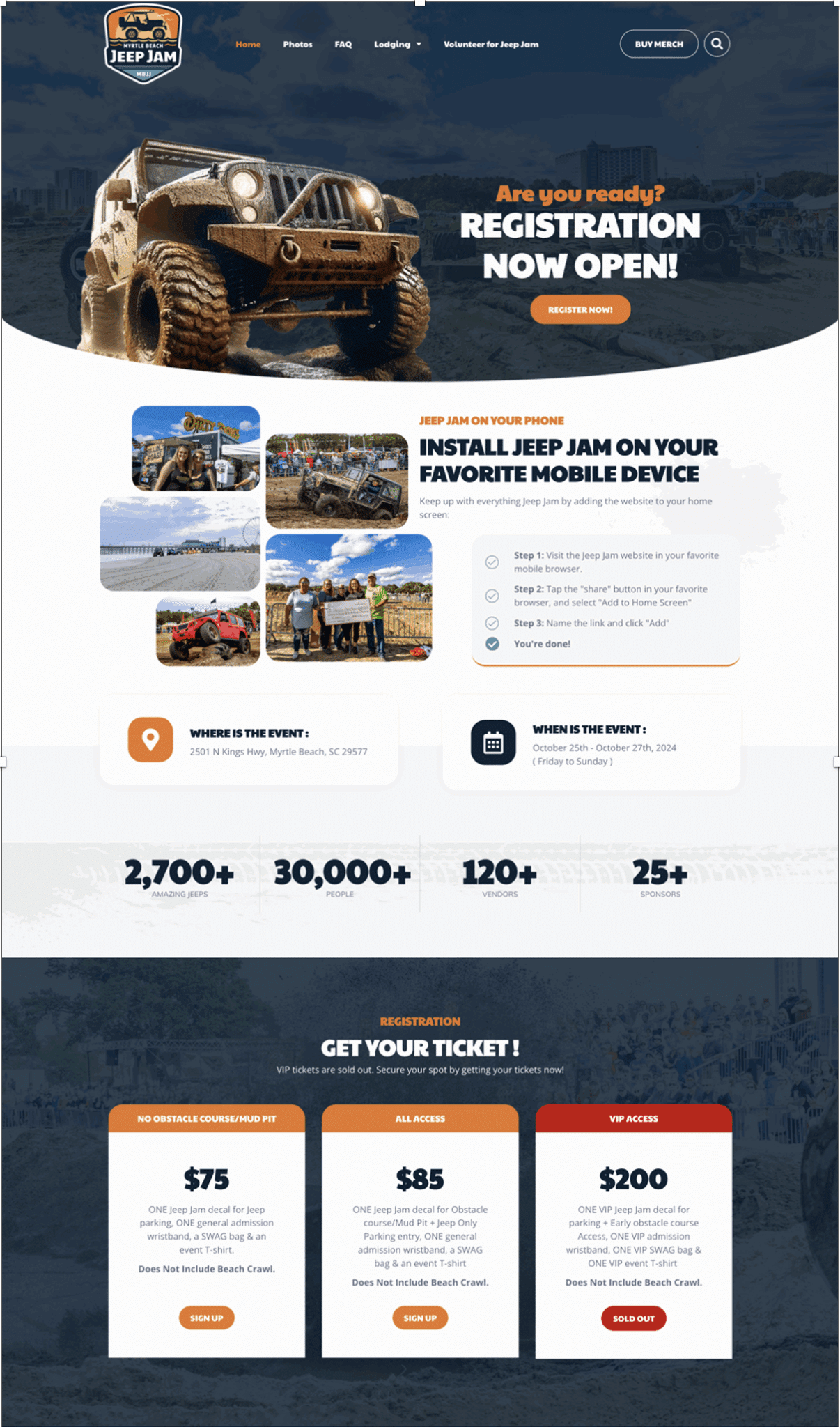 Myrtle Beach Jeep Jam is one of the Southeast’s premier Jeep events, drawing thousands of enthusiasts to Myrtle Beach each year for a weekend of community, adventure, and off-road excitement. The event team needed a website that reflected their established brand, supported a fast-paced annual cycle, and could easily adapt before, during, and after the event.